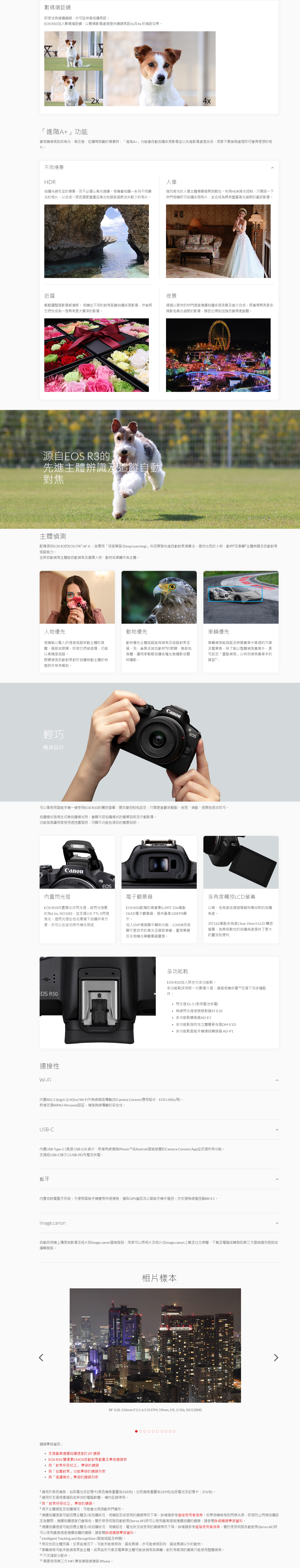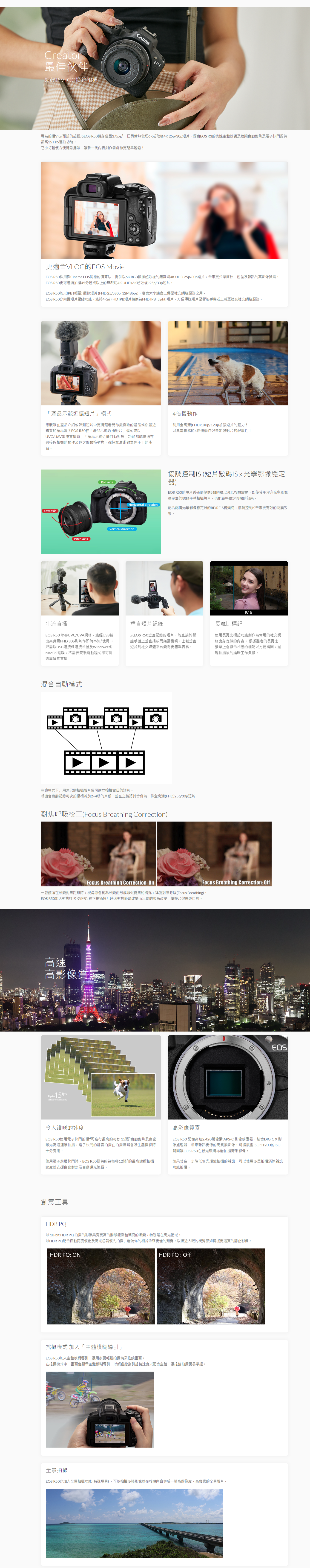 EOS R50亦加入源自EOS R3的先進主體辨識及追蹤自動對焦及電子快門提供最高15 FPS連拍,配合「創意包圍」及「進階A+」等影像功能,是新一代內容創作者創作網上內容的最佳輕巧伙伴。