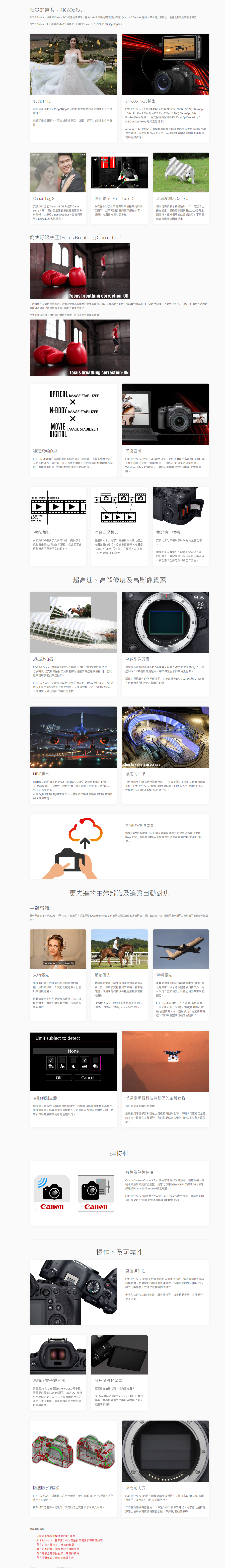 EOS R6 Mark II是為用家帶來最佳相片及短片拍攝混合拍攝體驗而設計,配備更先進的主體辨識及自動對焦追蹤能力、電子快門提供最高40 FPS連拍及支援經HDMI外錄無裁切6K 60p 10-bit ProRes RAW 短片﹐卓越的性能滿足不同的內容創作者其攝影及攝錄的需要,帶來更廣闊的創意空間。