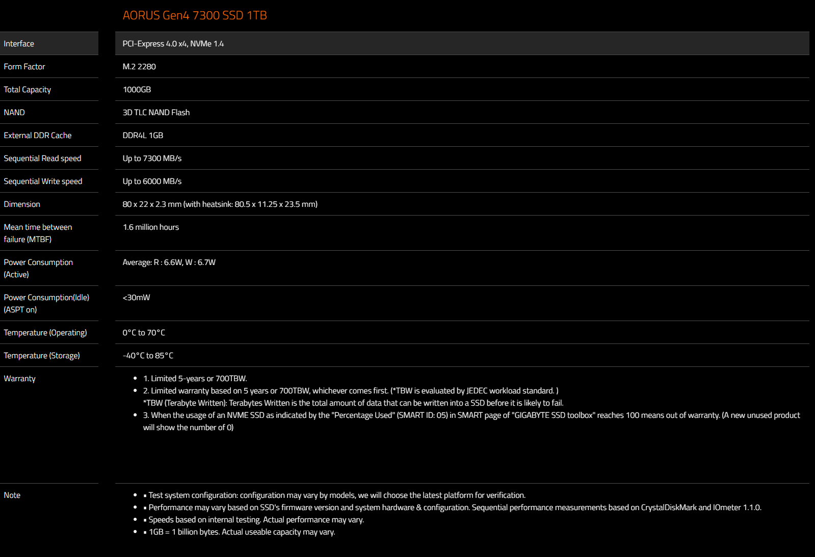 AORUS Gen4 7300 SSD delivers sequential read up to 7.3GB/s with 8 Channel controller- Phison E18- and 3D TLC NAND. The E18 controller is built with the advanced 12nm process ensuring sufficient computing power. Also it supports up to 8 NAND Flash channel with 32CE, DDR4 SLC caching and meets NVMe 1.4.