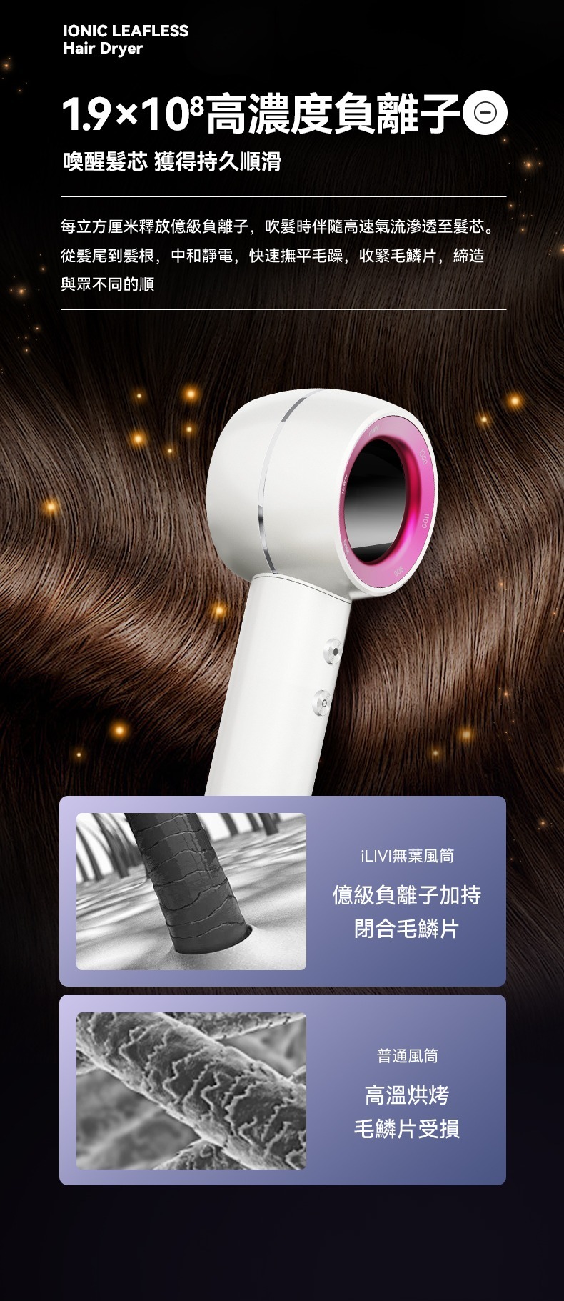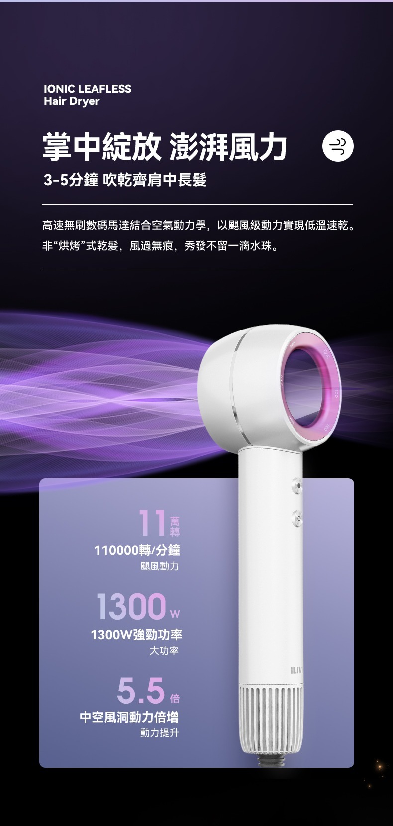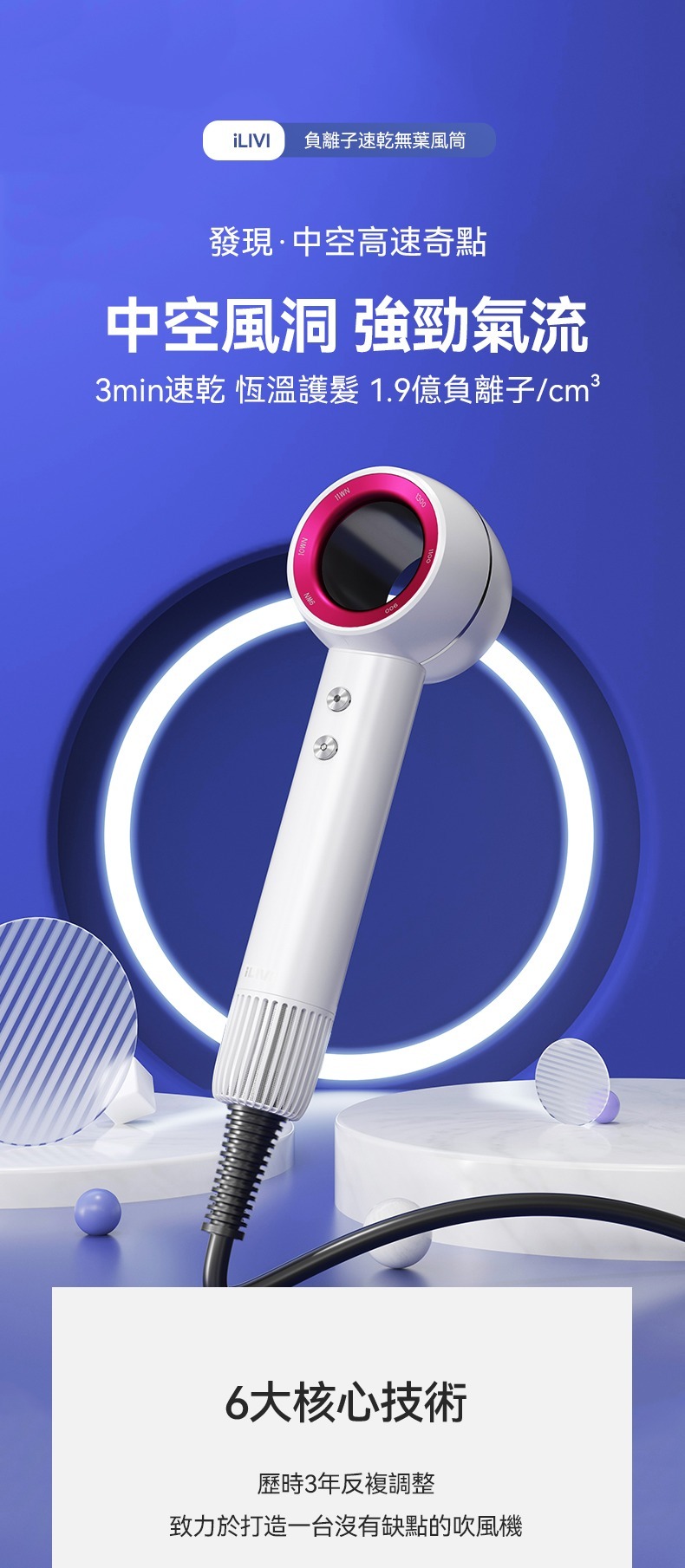 iLivi 負離子速乾無葉風筒全新無葉設計,最強1.9億負離子/cm³護髮技術,超強降噪處理67db低噪音,小體型超大風,快速3分鐘速乾。