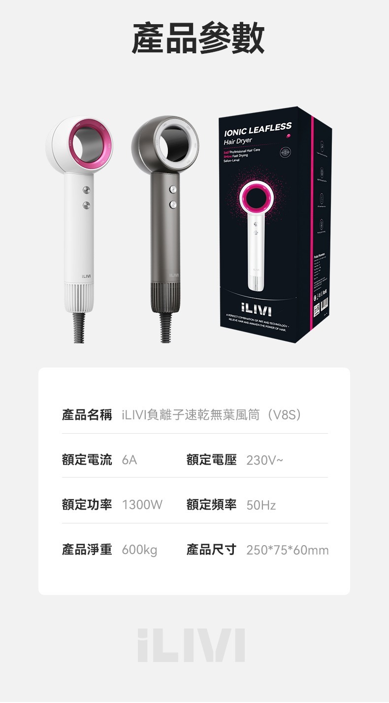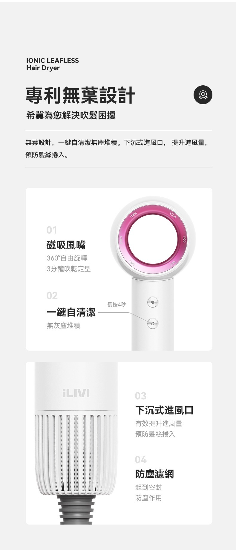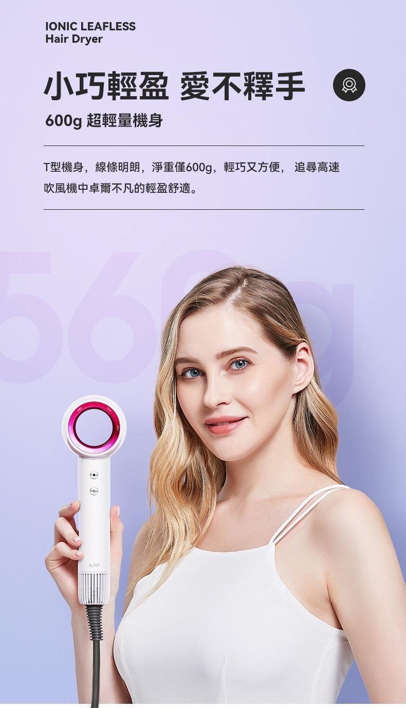 iLivi 負離子速乾無葉風筒全新無葉設計,最強1.9億負離子/cm³護髮技術,超強降噪處理67db低噪音,小體型超大風,快速3分鐘速乾。