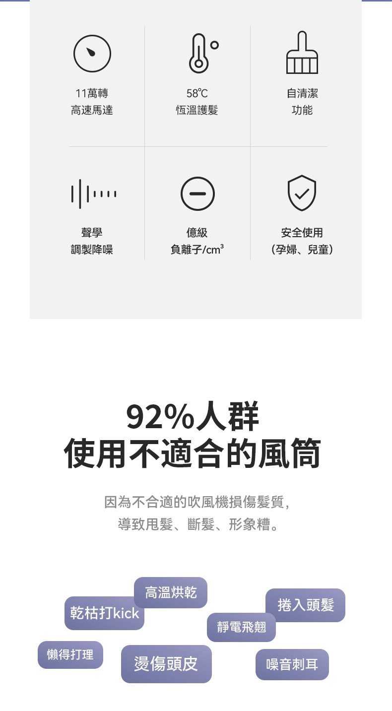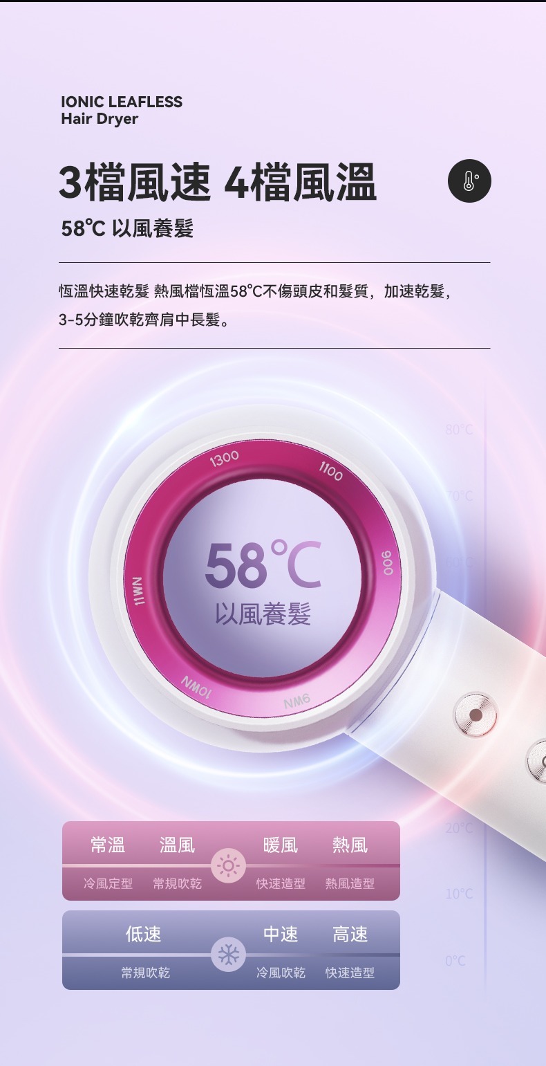 -內置智能溫控系統,高風速帶走水分,熱而不燙,58℃智能恆溫不傷髮