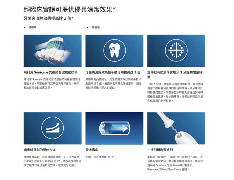 Philips Sonicare 聲波科技可以將水份推往牙縫,而刷毛震動則可有效去除牙菌膜,達致每日潔淨效果。