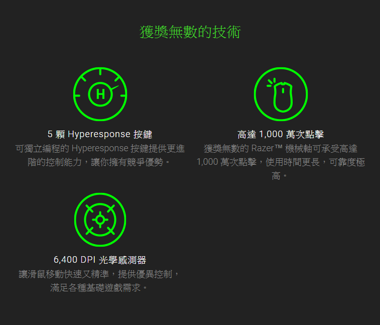 獲獎無數的 Razer 機械軸可承受高達 1,000 萬次點擊,使用時間更長,可靠度極高。