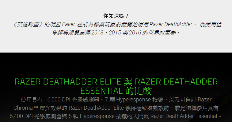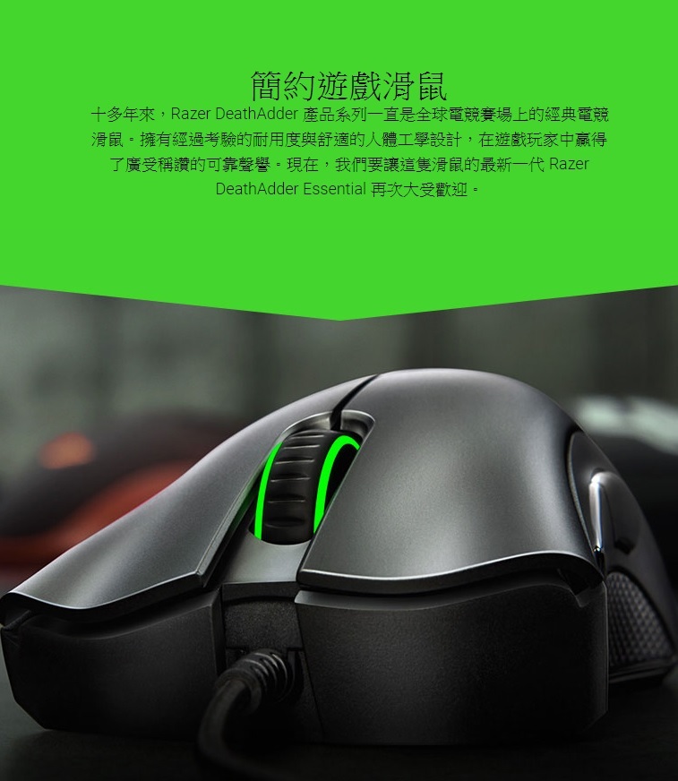 Razer DeathAdder Essential 保留了 Razer DeathAdder 世代經典的人體工學外型。時尚顯眼的機身兼具舒適使用度,可讓你在長時間的遊戲馬拉松中保持優異表現,永不畏懼戰火。